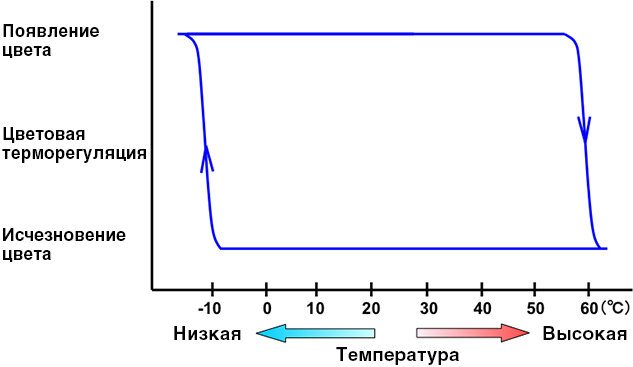 График, отображающий особенности чернил «Фрикшн», которые при определенных температурных условиях теряют цвет, а при других приобретают. С увеличением температурного диапазона расширяется сфера применения ручек, использующих данные чернила (предоставлено корпорацией «Пилот»)
