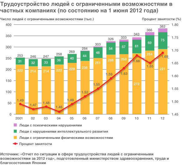 Согласно статистике, опубликованной в «Отчете по ситуации в сфере трудоустройства людей с ограниченными возможностями за 2012 год», по состоянию на первое июня 2012 года около 380 тысяч людей с ограниченными возможностями работали в частных компаниях – то есть на 4,4% больше по сравнению с предыдущим годом. Таким образом, в 2012 году доля «особых» работников составила 1,69% от общего числа работников частных компаний. И тот и другой показатель – исторические рекорды, но при этом доля фирм, в которых процент занятости достиг установленного законом минимума в 1,8%, составила 48,6 % от общего числа компаний, то есть даже меньше половины. «Количество крупных корпораций, достигших предписанного показателя, неуклонно растет, но у среднего и мелкого бизнеса пока не хватает на это сил. Многие компании еще далеки от цели», – говорит Арисава Тиэ, заместитель директора отдела планирования Японской организации по содействию трудоустройству престарелых граждан и инвалидов.