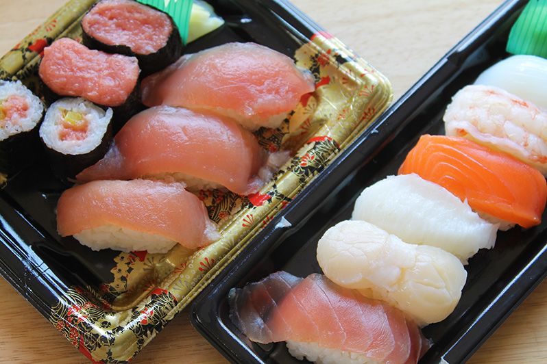 Среди привычного ассортимента упакованных обедов, с прошлого (2012) года глаз посетителя останавливается на поступивших в продажу суси. Многих, вероятно, удивило, как можно выставлять на прилавок комбини товары с сырой рыбой. Мы привыкли, что суси делает мастер на глазах покупателя, а тот тут же их ест. Второй момент, транспортировка до витрины магазина, тоже вызывает определенные сомнения относительно качества товара.