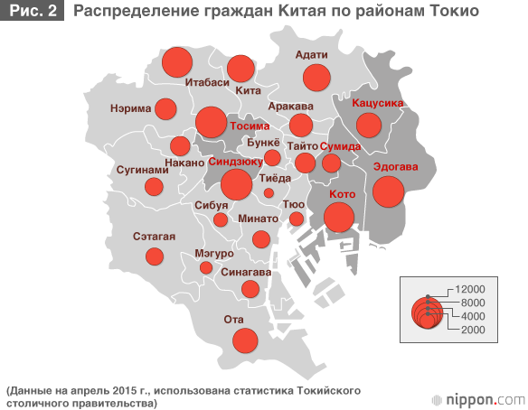 В последние годы в Токио отмечается прирост китайского населения не только в таких традиционных районах, как Синдзюку и Икэбукуро, но и в районах восточнее и севернее этих станций.
