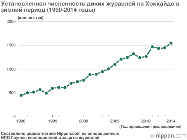 На обзорной площадке перед Центром несколько человек, глядя в бинокль, пересчитывают журавлей, нажимая на ручные счётчики. В январе-феврале 2017 года НПО Группа исследований и защиты журавлей занималась подсчётом численности поголовья журавлей в окрестностях болот Кусиро. Эта перепись журавлиного населения стала уже 32-й по счёту. Январь и февраль – самые холодные месяцы на Хоккайдо, нередки дни, когда температура воздуха падает ниже 20 градусов. Однако это оптимальное время для пересчёта журавлей, прилетающих на площадку в поисках пищи. В переписи участвует 70 волонтёров под руководством директора НКО Момосэ Куникадзу. Среди волонтёров есть студенты, сотрудники компаний, ветеринары, исследователи, работники зоопарка, литературные переводчики, однако всех этих людей, самому младшему из которых 19, а самому старшему – 85 лет, объединяет любовь к журавлям. Некоторые приезжают сюда из Токио и префектуры Хёго. Есть среди них и ветераны, приезжающие на пересчёт птиц начиная с самого первого раза.