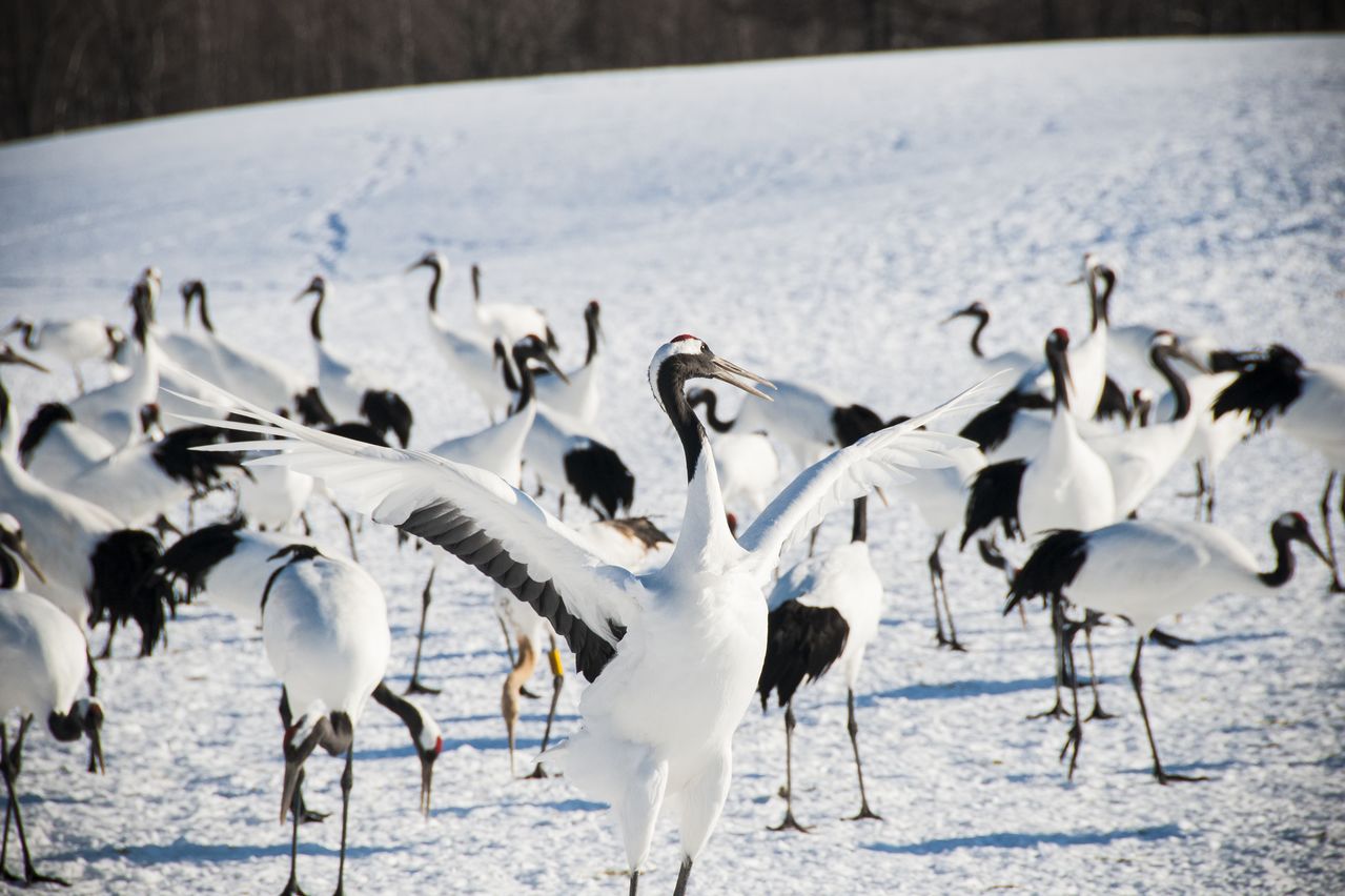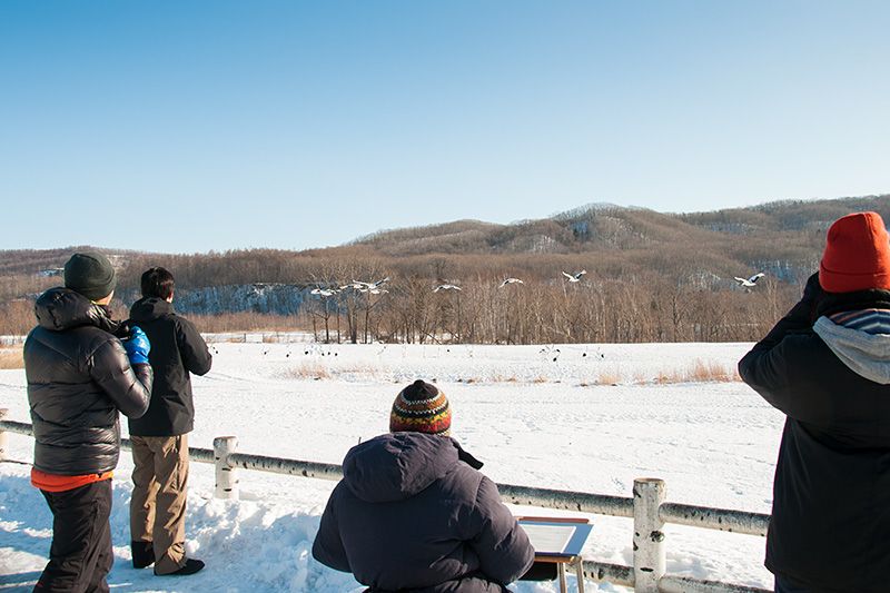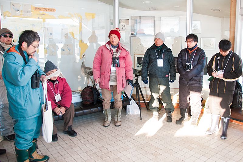 На обзорной площадке перед Центром несколько человек, глядя в бинокль, пересчитывают журавлей, нажимая на ручные счётчики. В январе-феврале 2017 года НПО Группа исследований и защиты журавлей занималась подсчётом численности поголовья журавлей в окрестностях болот Кусиро. Эта перепись журавлиного населения стала уже 32-й по счёту. Январь и февраль – самые холодные месяцы на Хоккайдо, нередки дни, когда температура воздуха падает ниже 20 градусов. Однако это оптимальное время для пересчёта журавлей, прилетающих на площадку в поисках пищи. В переписи участвует 70 волонтёров под руководством директора НКО Момосэ Куникадзу. Среди волонтёров есть студенты, сотрудники компаний, ветеринары, исследователи, работники зоопарка, литературные переводчики, однако всех этих людей, самому младшему из которых 19, а самому старшему – 85 лет, объединяет любовь к журавлям. Некоторые приезжают сюда из Токио и префектуры Хёго. Есть среди них и ветераны, приезжающие на пересчёт птиц начиная с самого первого раза.