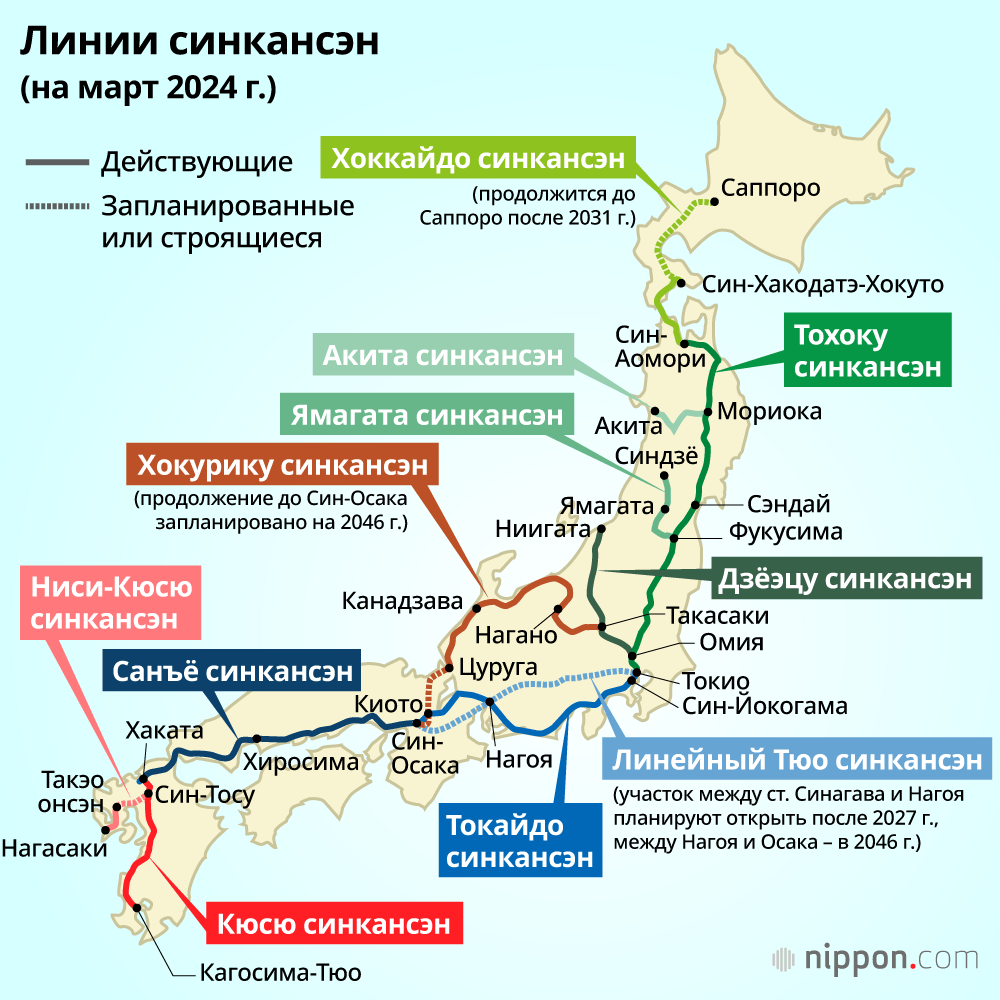 | Хоккайдо-синкансэн | Син-Хакодатэ-Хокуто–Саппоро | после 2031 г. | Токио–Саппоро 5 ч |