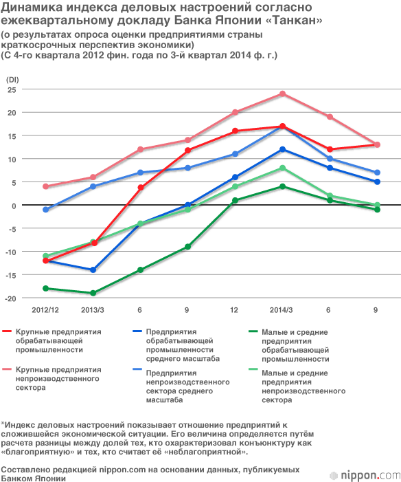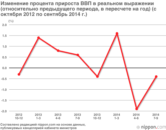 Окончательным фактором, повлиявшим на решение о том, следует ли осуществлять повторное повышение потребительского налога (первое повышение состоялось в апреле текущего года, ставка была увеличена с 5% до 8% — прим. перев.) стали статистические данные о валовом внутреннем продукте за квартал с июля по сентябрь. Согласно оглашённым 17 ноября результатам подсчёта ВВП, показатель реального роста ВВП в годовом исчислении составил -1,6%, продемонстировав отрицательное значение второй раз подряд вслед за кварталом с апреля по июнь. Поскольку результат оказался гораздо ниже средних ожиданий экономистов, он произвел на рынке эффект шоковой волны. Стали подтверждаться подозрения о том, что личное потребление, на которое в Японии приходится порядка 60% ВВП, отреагировав стагнацией на апрельское повышение ставки потребительского налога до 8%, так и не восстанавливается.