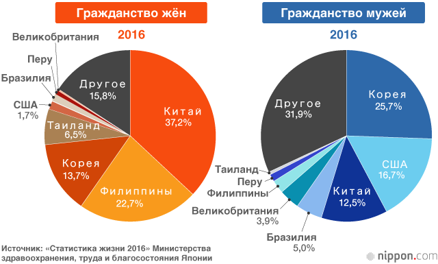По данным демографического исследования Министерства здравоохранения, труда и благосостояния Японии, среди граждан Японии, вступивших в международные браки в 2016 году, было 14 851 мужчин и 6329 женщин.