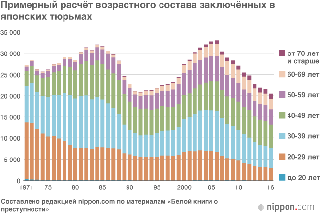 По всей Японии увеличивается процент пожилых людей среди отбывающих наказание осуждённых. В прошлом было принято считать, что на преступления идёт безрассудное молодое поколение, а с возрастом человек обзаводится семьёй, и идти на антиобщественные деяния становится чем дальше, тем труднее. На самом деле, тридцать лет назад, в 1976 году доля людей в возрасте от 60 лет и старше составляла среди заключённых 2,5%. Однако согласно ежегодному официальному докладу – «Белой книге о преступности», в 2017 году из общего числа заключённых, которых насчитывалось 20 476 человек, таких людей оказалось 3750, или 18,3%.
