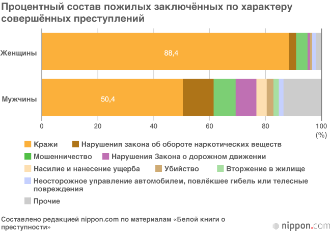 По характеру преступлений, совершённых пожилыми заключёнными, как среди мужчин, так и женщин на первом месте находятся кражи, при этом в особенности бросается в глаза величина доли таких деяний у женщин: 88,4%. Немало среди пожилых людей и тех, кто, столкнувшись с жизненными трудностями, одну за другой совершает магазинные кражи, чтобы попасть в тюрьму, где обеспечено по меньшей мере место для сна и трёхразовое питание, а отбыв положенный срок, они спешат совершить аналогичные преступления, чтобы вновь оказаться за решёткой. Можно сказать, что тюрьма становится своего рода спасательным кругом, способным уберечь от гибели.