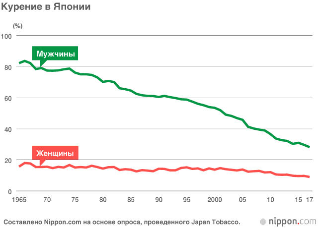 Согласно ежегодному исследованию табакокурения в Японии, проведенному компанией Japan Tobacco, доля курящих мужчин и женщин в 2017 году составляла соответственно 28,2% и 9,0%. Процентное соотношение для курящих мужчин и женщин в тридцатые, сороковые и пятидесятые годы было намного выше.