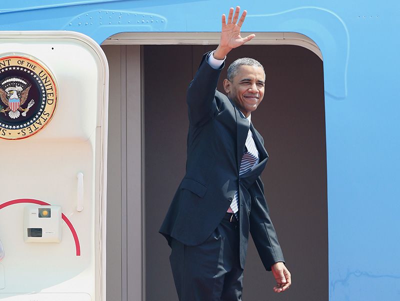Президент Барак Обама перед вылетом на президентском самолете из аэропорта Ханэда по окончании государственного визита в Японию (© Jiji Press)