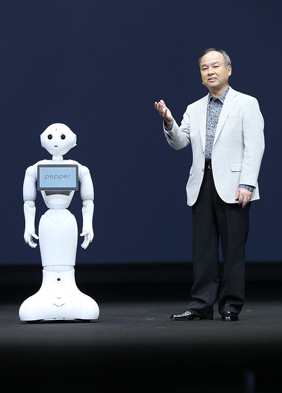 Главный исполнительный директор компании Softbank Сон Масаёси и робот Pepper (© Jiji)
