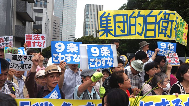Участники протеста держат плакаты с обращением «Не разрушай 9-ю статью», по которой Япония навсегда отказывается от ведения войн.