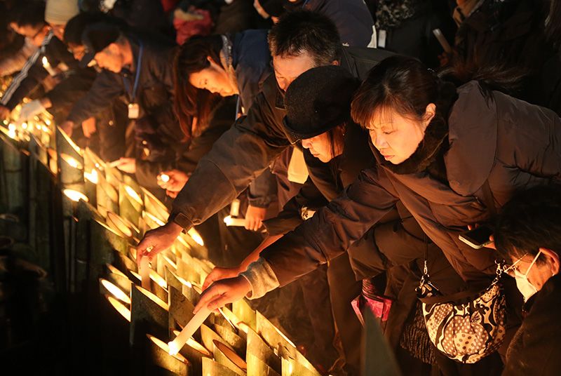 Фото: люди зажигают бамбуковые фонарики в память жертв Великого землетрясения Хансин-Авадзи, 17 января 2015 г., парк Хигасиюэнти, город Кобэ, район Тюо (предоставлено Jiji Press)
