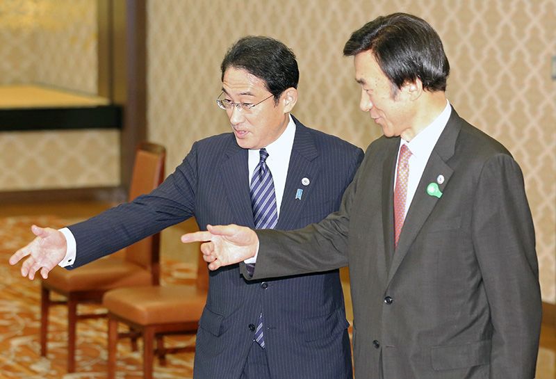 Министр иностранных дел Кисида Фумио провёл переговоры с главой внешнеполитического ведомства Южной Кореи Юн Бён Се, который посетил Японию впервые со времени вступления в должность в феврале 2013 года. Помимо согласия стремиться к скорейшему проведению в текущем году трёхстороннего саммита с участием лидера Китая, стороны договорились о том, что выступавшая прежде с возражениями Южная Корея будет сотрудничать в решении вопроса о внесении в список Всемирного наследия ЮНЕСКО ряда объектов в Японии, связанных с промышленной революцией периода Мэйдзи (1868–1912).