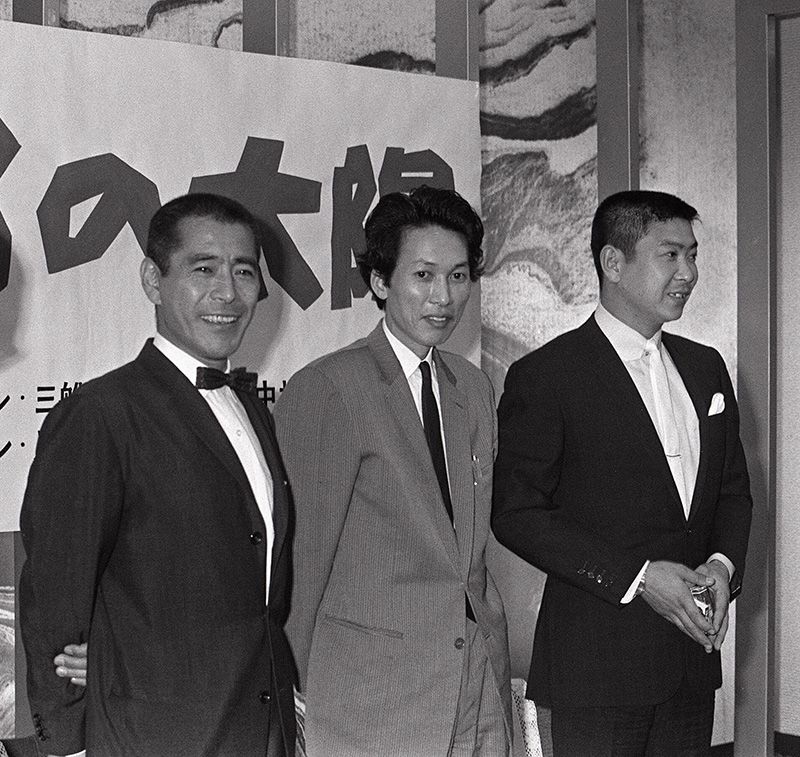 Мифунэ Тосиро (слева) перед пресс-конференцией, посвящённой выходу киноленты «Солнце над Куробэ». Справа - актёр Исихара Юдзиро, в центре режиссёр Кумаи Кэй. 9 мая 1967 г., Токио, столичный район Минато, гостиница «Окура» (фотография предоставлена Jiji Press)