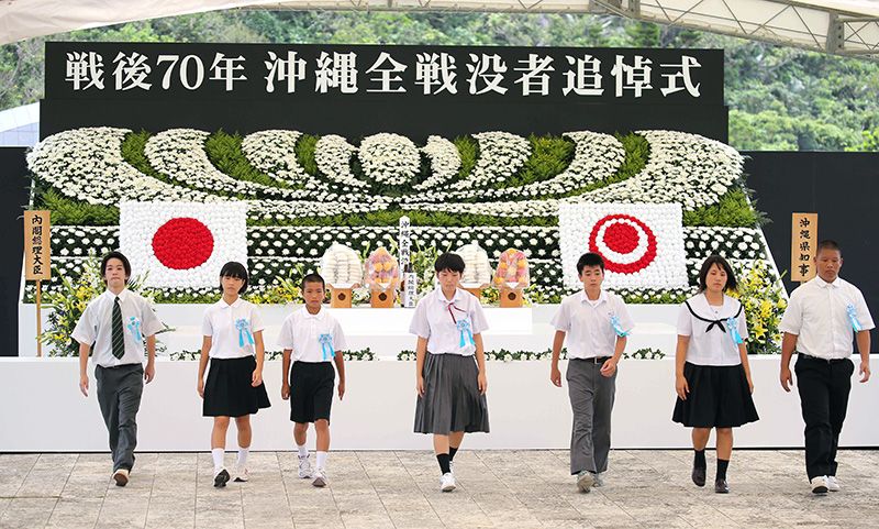 Исполнилось ровно 70 лет со времени окончания Битвы за Окинаву, унёсшей жизни более двухсот тысяч человек в завершающий период сражений на Тихоокеанском театре военных действий Второй мировой войны. В Мемориальном парке мира в городе Итоман состоялась церемония в память всех павших в годы войны на Окинаве. В числе приблизительно 5 400 участников на церемонии присутствовали премьер-министр Абэ Синдзо, а также посол США в Японии Кэролайн Кеннеди. Губернатор префектуры Окинава Онага Такэси огласил «Декларацию мира», в которой выступил с резкой критикой плана переноса американской авибазы Футэмма на побережье Хэноко города Наго, над реализацией которого работает правительство Абэ.