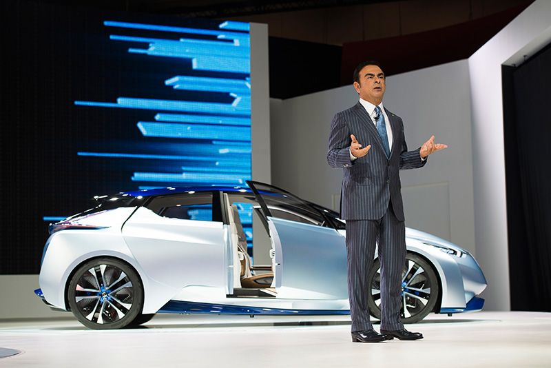 Президент и CEO компании Nissan Motor Co., Ltd. Карлос Гон проводит пресс-конференцию на фоне концепт-кара, оснащённого функцией автоматического вождения, 28 октября 2015 г.
