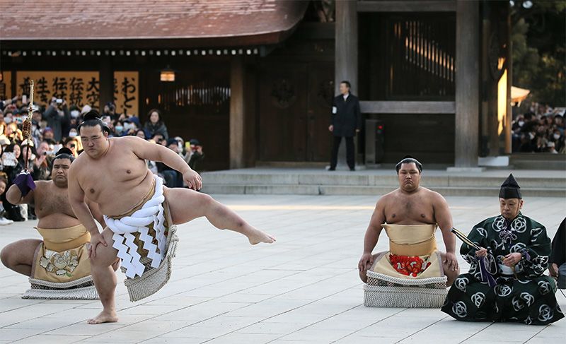 Возведённый в ранг ёкодзуна Кисэносато (второй слева) во время ритуала выхода на ринг. С левого края Такаясу, выступающий в роли татимоти (меченосца), третий слева Сёходзан в роли цуюхараи (герольда), 27 января, токийский район Сибуя, святилище Мэйдзи-дзингу (фотография представлена Jiji Press)