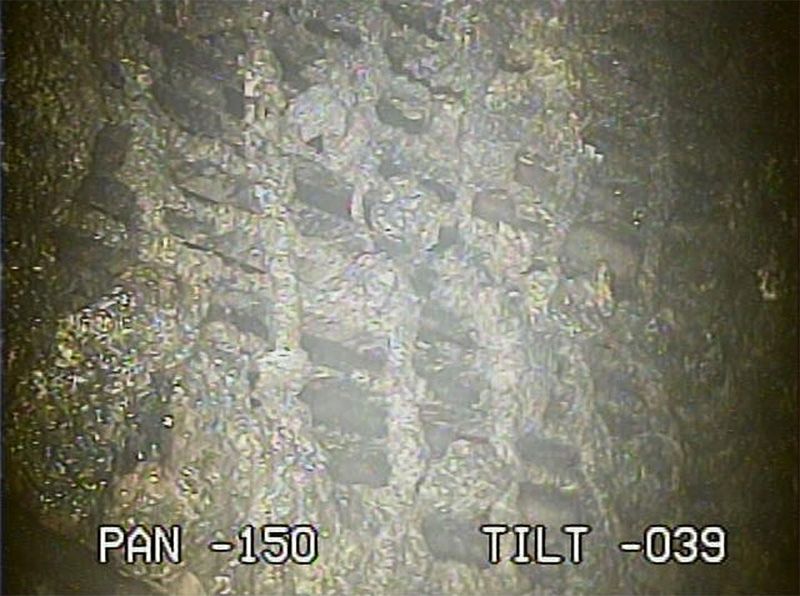 Сгустки расплава на решётчатой рабочей площадке, обнаруженные при обследовании внутренней части реактора №2 АЭС «Фукусима-1» (фотография TEPCO, предоставлена JIJI Press)