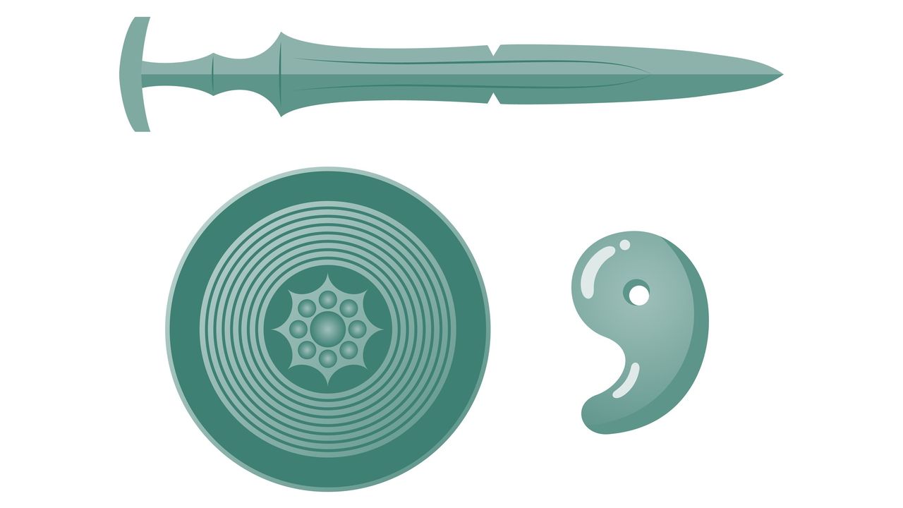 Императорские регалии Японии, также известные как «три божественных предмета» сансю-но дзинги, – это зеркало Ята-но кагами, меч Кусанаги-но цуруги и изогнутая каплеобразная драгоценность Ясакани-но магатама. Согласно легенде, род императоров Японии происходит от богини солнца Аматэрасу; зеркало и драгоценность фигурируют в мифе о том, как она спряталась в пещере, и другие боги её выманивали, чтобы вернуть свет на небеса; они повесили на дерево зеркало, Аматэрасу была обманута, увидев своё зеркальное отражение, и покинула пещеру. Что касается меча, то его обнаружил Сусаноо, брат Аматэрасу, в теле сражённого им гигантского змея, и позже преподнёс меч ей.