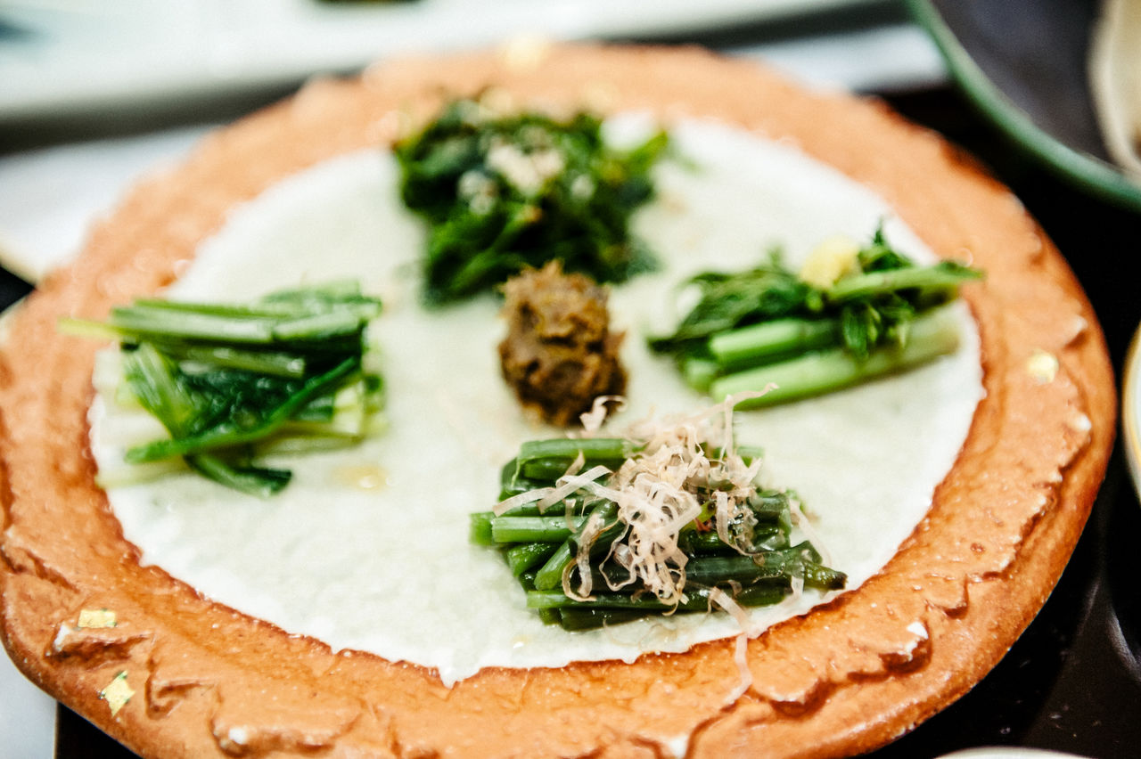 Сато: В весенние месяцы мы предлагаем от двадцати до тридцати различных съедобных растений. Мы стараемся порадовать наших клиентов знаменитым деревенским гостеприимством, поэтому делаем все возможное, чтобы добавить лоска нашим скромным овощам. Ужин обычно начинается с ряда изысканных холодных блюд, включая о-хитаси (бланшированные овощи, обычно зелёные, пропитанные острым бульоном даси). За этим следует что-то тёплое и сытное, часто это набэ (жаркое в горшочке) и тэмпура.