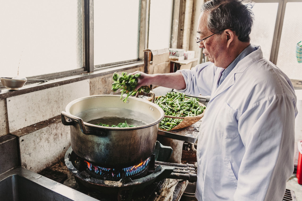 Сато Харухико, владелец «Дэвая» в третьем поколении, погружает побеги в слегка подсоленную кипящую воду