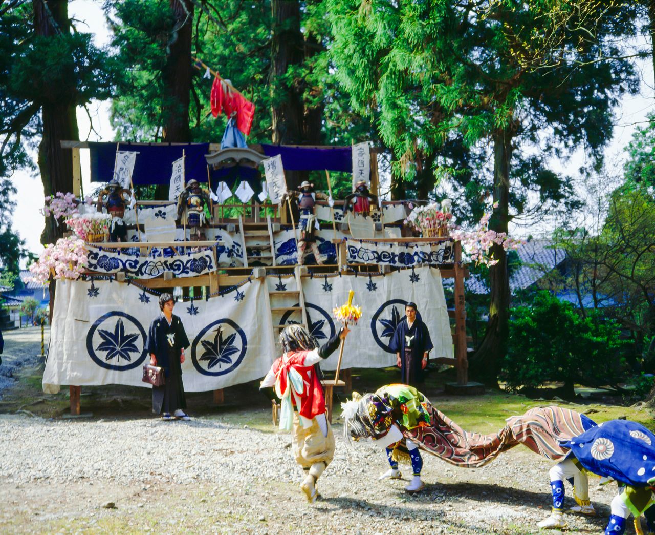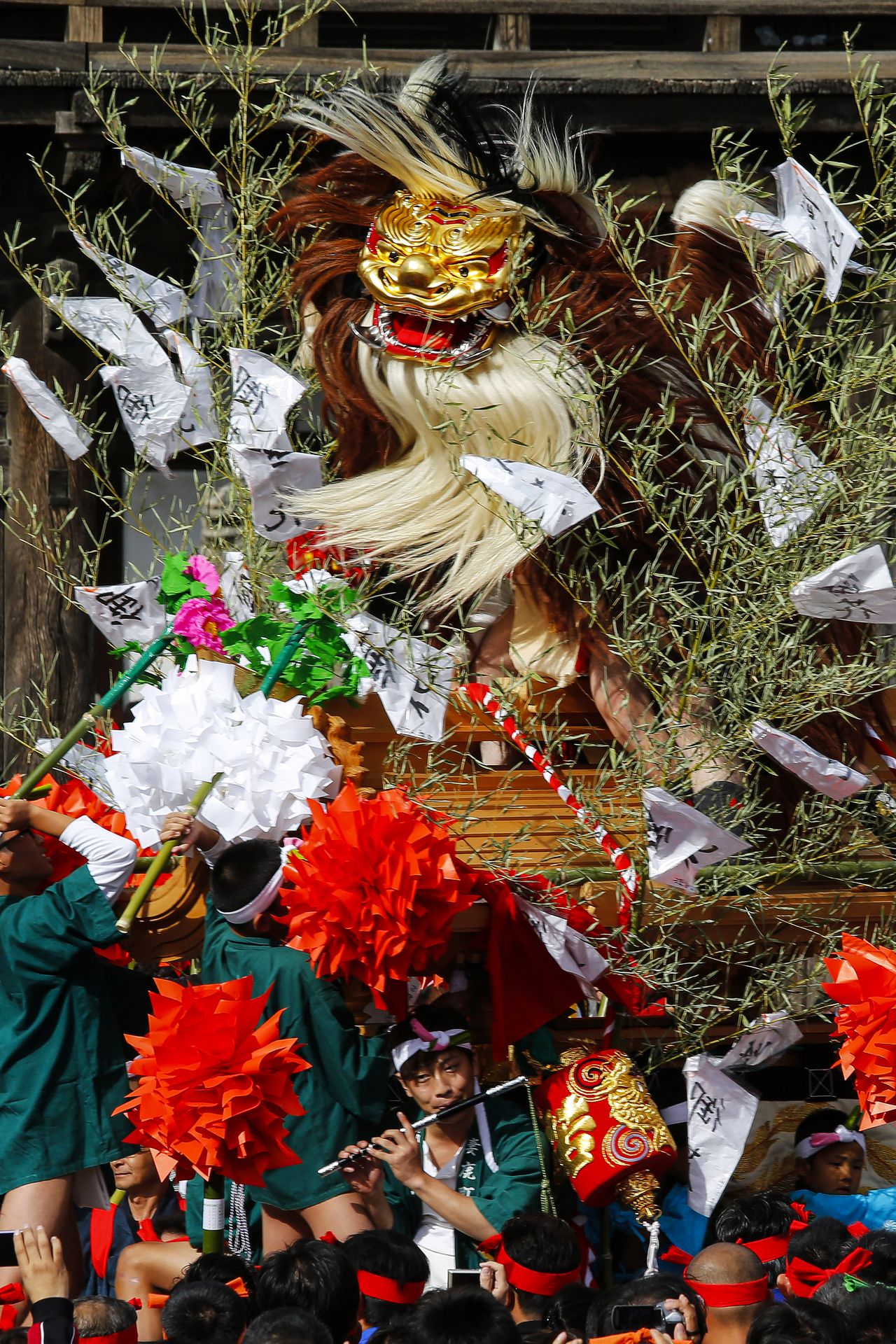 Во главе процессии несут огромные знамёна и исполняют «танец льва» сисимаи, проносят «львиную платформу», предваряя внос в святилище главной праздничной платформы (© Haga Library)