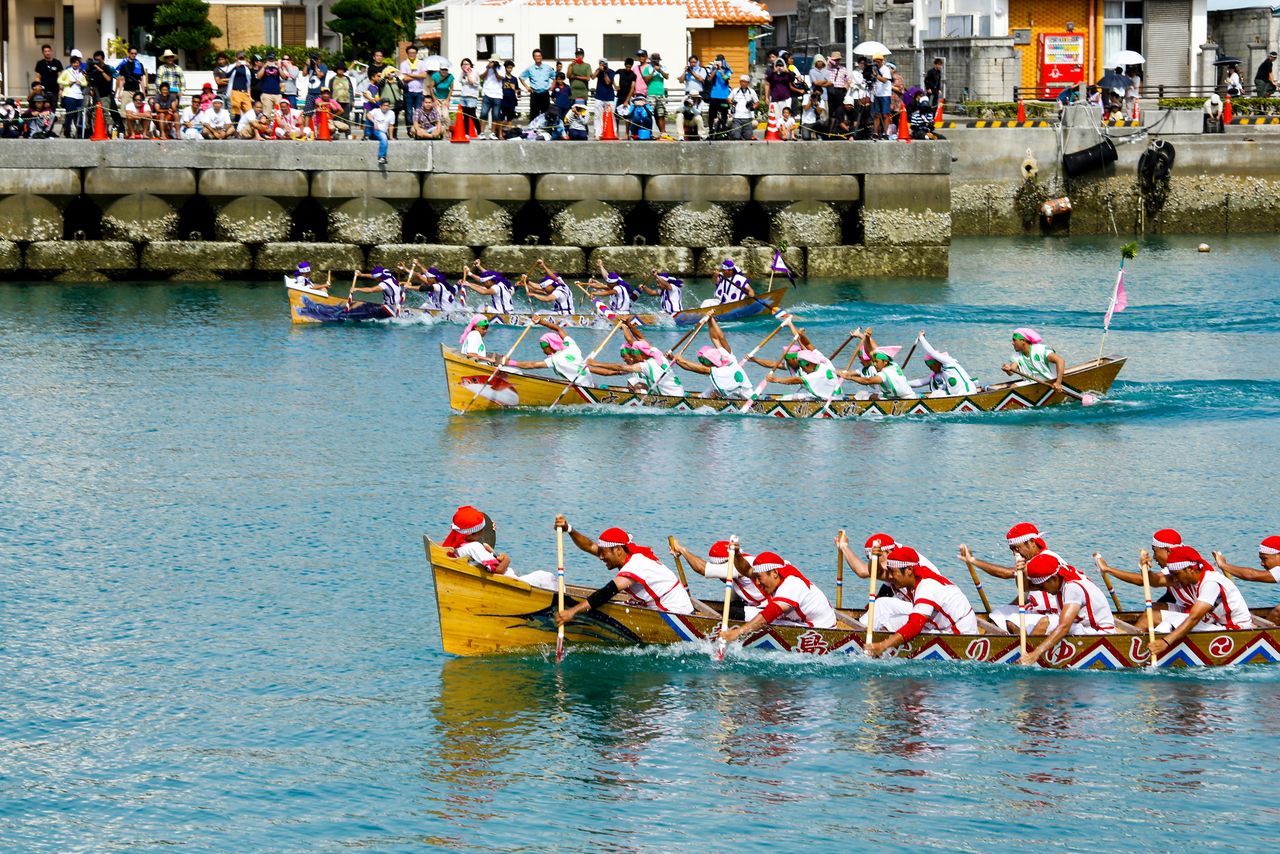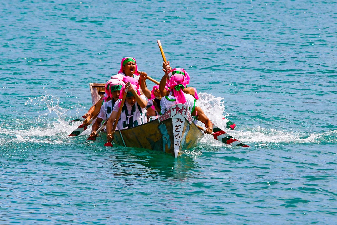 На празднике соревнования между четырьмя лодками проходят в четыре заезда; побеждает лодка, набравшая наибольшее количество очков. В каждой лодке 14 гребцов, барабанщик тайко, который задает ритм, ведущий лодочник с большим веслом, направляющий курс лодки, и молодые мальчики поддержки на носу и корме.