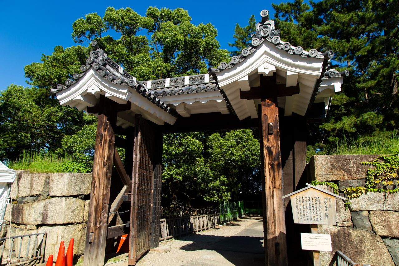Ворота Омотэ-Ниномон южной стороны площадки Хоммару, Важное культурное достояние; отверстия по обеим сторонам – ружейные бойницы (тэпподзама)
