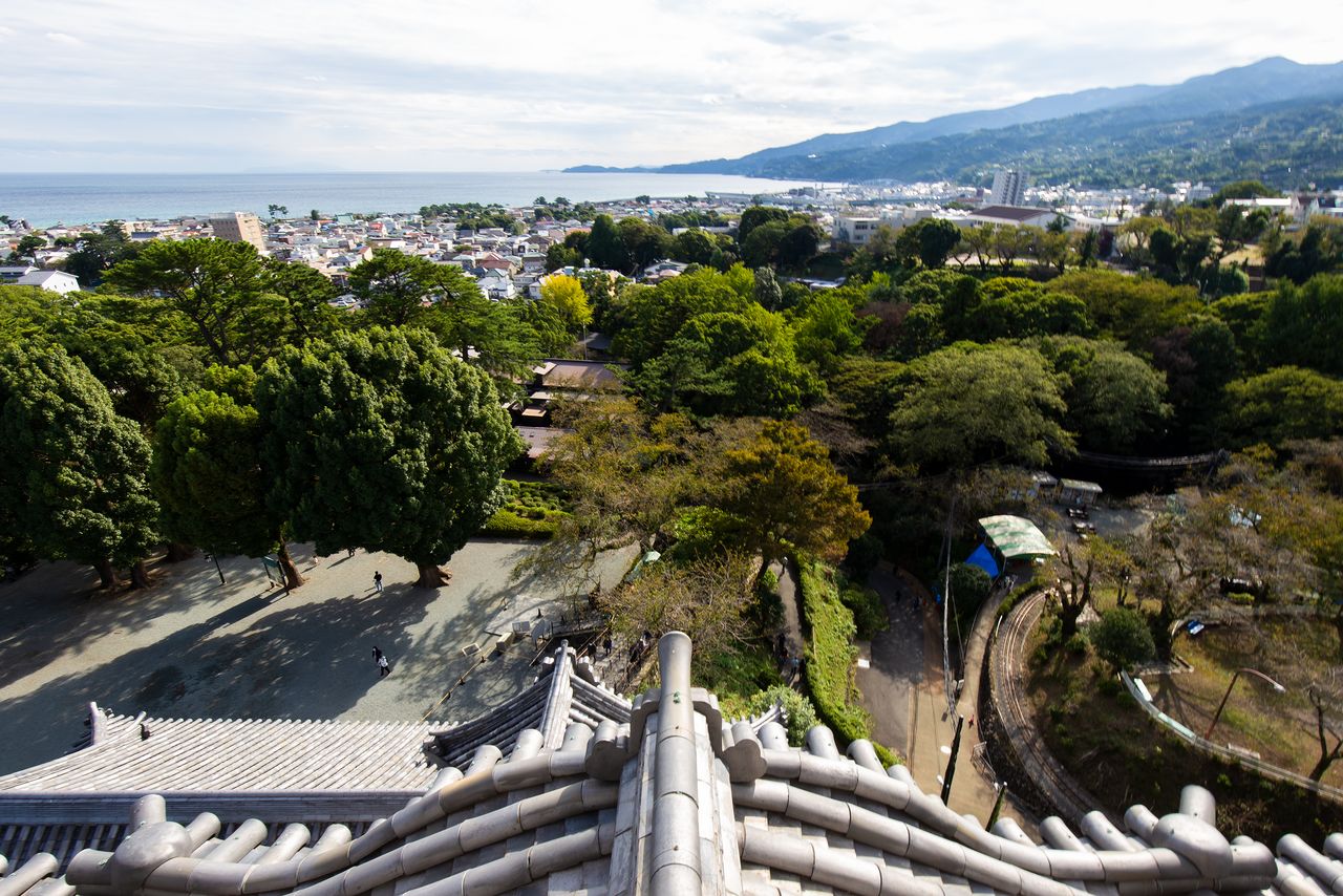Вид со смотровой площадки на верхнем этаже башни замка; справа вдали виднеется полуостров Идзу