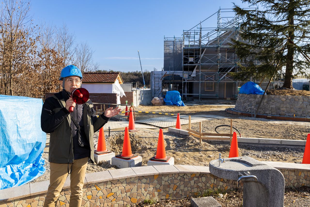 Белое здание позади директора Миядзаки Горо, руководящего строительством, – «Кошачья контора»; строящееся здание с лесами – лавка «Тикюя» (© 2022 Studio Ghibli)