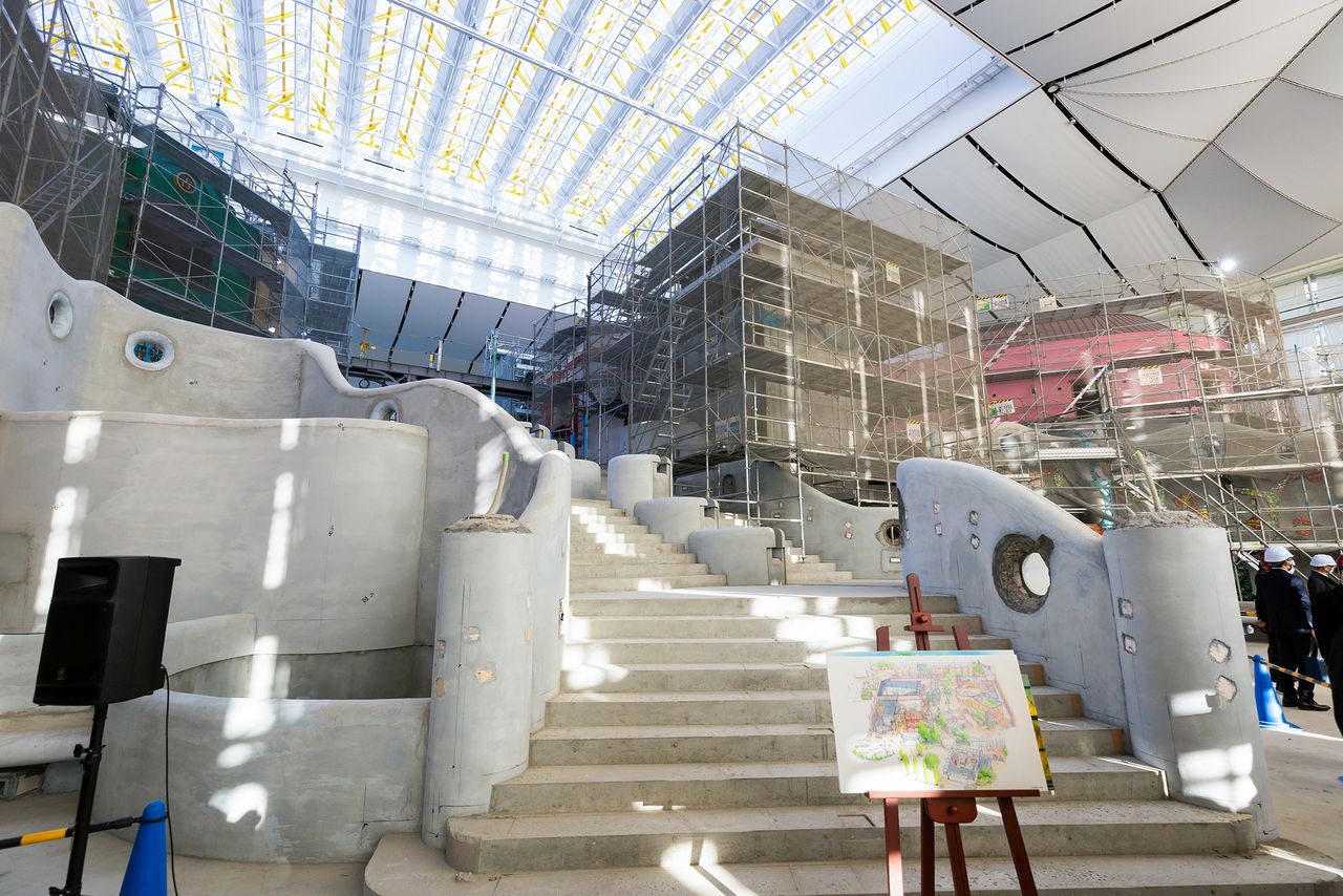 Строительная площадка «Большого склада Гибли», это будет пространство отдыха с естественным освещением (© 2022 Studio Ghibli) Эскиз «Большого склада Гибли», там будет также элегантное летнее кафе (© Studio Ghibli)