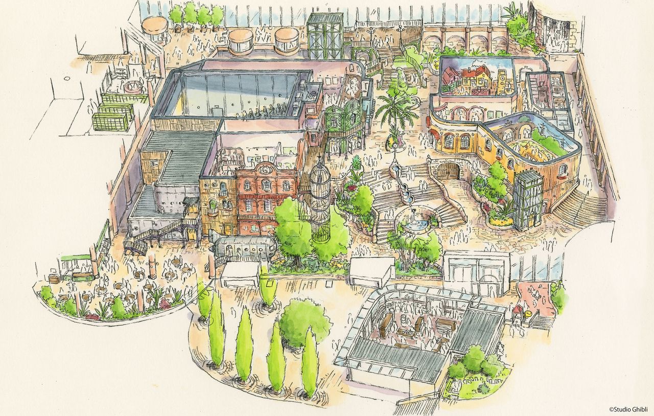 Эскиз «Большого склада Гибли», там будет также элегантное летнее кафе (© Studio Ghibli)