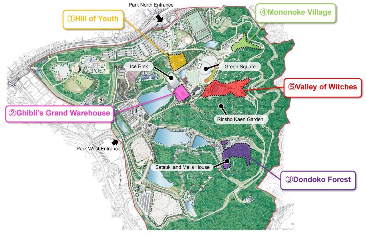 «Деревня Мононокэ», открытие которой запланировано на 2022 год, воспроизводит пейзаж горной деревни племён эмиси и железоплавильные печи татара, которые появляются в «Принцессе Мононокэ». В зоне «Долина ведьм» будет создано пространство в европейском стиле с домом Окино из «Службы доставки Кики», замком Хаула и Пустошью.