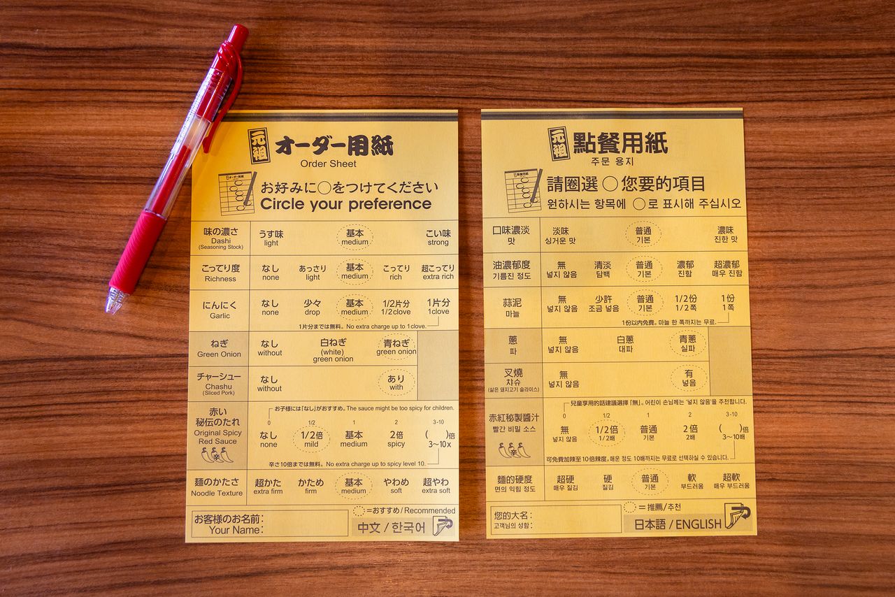 На бланке заказа можно выбрать степень насыщенности бульона и различные добавки. Бланки доступны на четырёх языках: японском, английском, китайском и корейском (© Nippon.com)