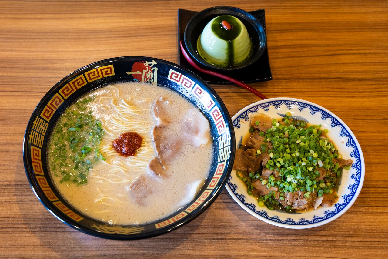 Стандартный натуральный рамэн тонкоцу, популярное блюдо из тушёной свинины со вкусом копчёностей и миндальный пудинг с соусом из зелёного чая на десерт (© Nippon.com)