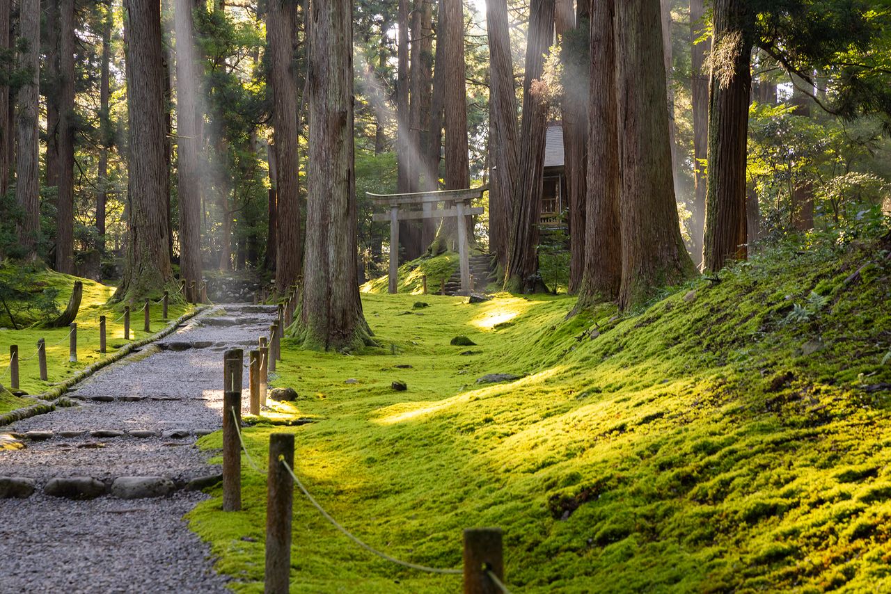 Солнечные лучи освещают мох на священной тропе, ведущей к святилищу Кайдзанся, где почитают Тайтё (© Nippon.com)