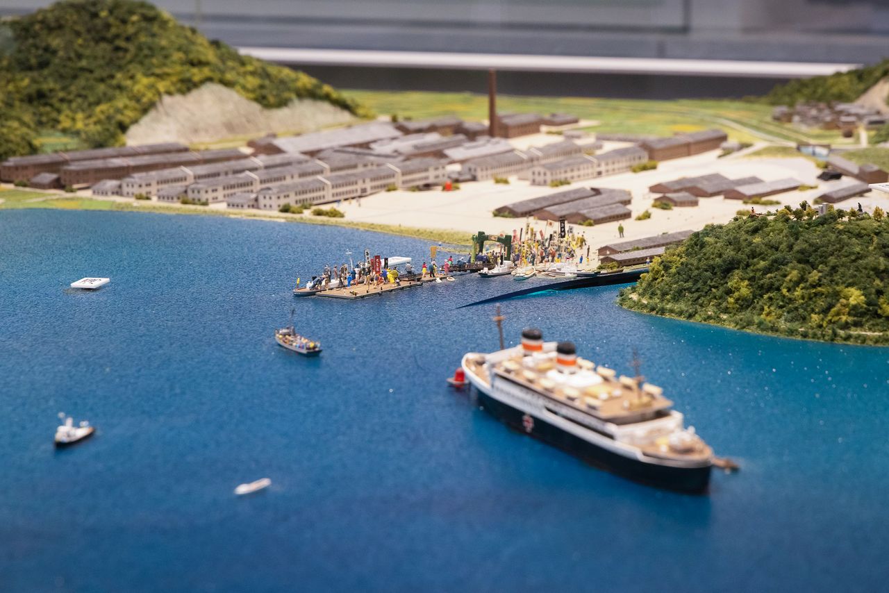 Реконструкция процесса высадки. Люди пересаживались с репатриационного судна на небольшой паром, после чего высаживались на пирс. Ряды зданий у пирса принадлежали Бюро помощи репатриации