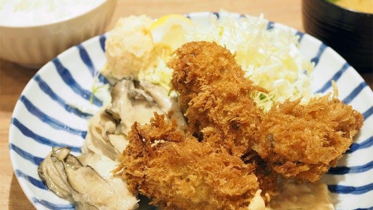 Устрицы какифрай и какибата с рисом и супом мисо составляют комплексный обед «Устричный микс» (1950 йен с налогом)