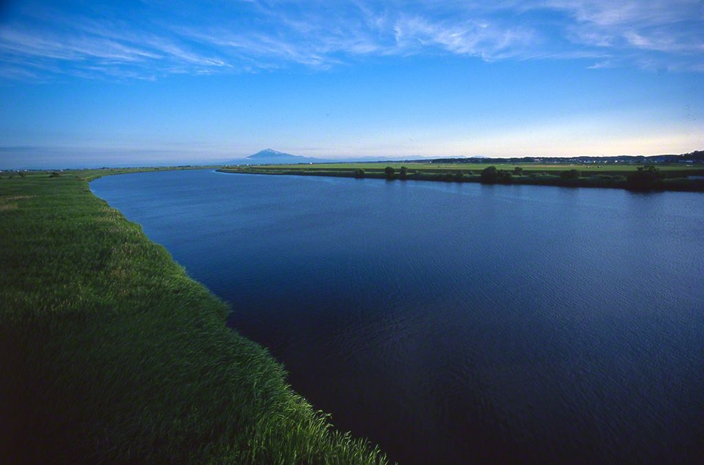 Комментарии фотографа: Величественная гора Иваки, которую называют «Фудзи региона Цугару», видна практически отовсюду вдоль течения реки, и если спускаться по реке, гора выглядит всё более прекрасной. Яблоневые сады и плавни – одни из отличительных черт этой реки.