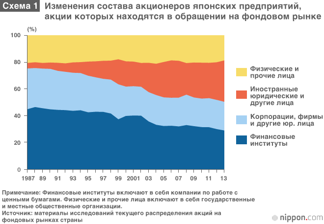 Во-первых, в целом наблюдается долгосрочное изменение соотношения состава акционеров предприятий, чьи акции котируются на бирже. Как видно из схемы 1, доля зарубежных держателей акций, которая по состоянию на 1987 финансовый год не превышала четырёх процентов, уверенно возрастала, и в 2013-м году достигла 30,8%, превысив доли, которые приходятся на японские финансовые институты и коммерческие предприятия.