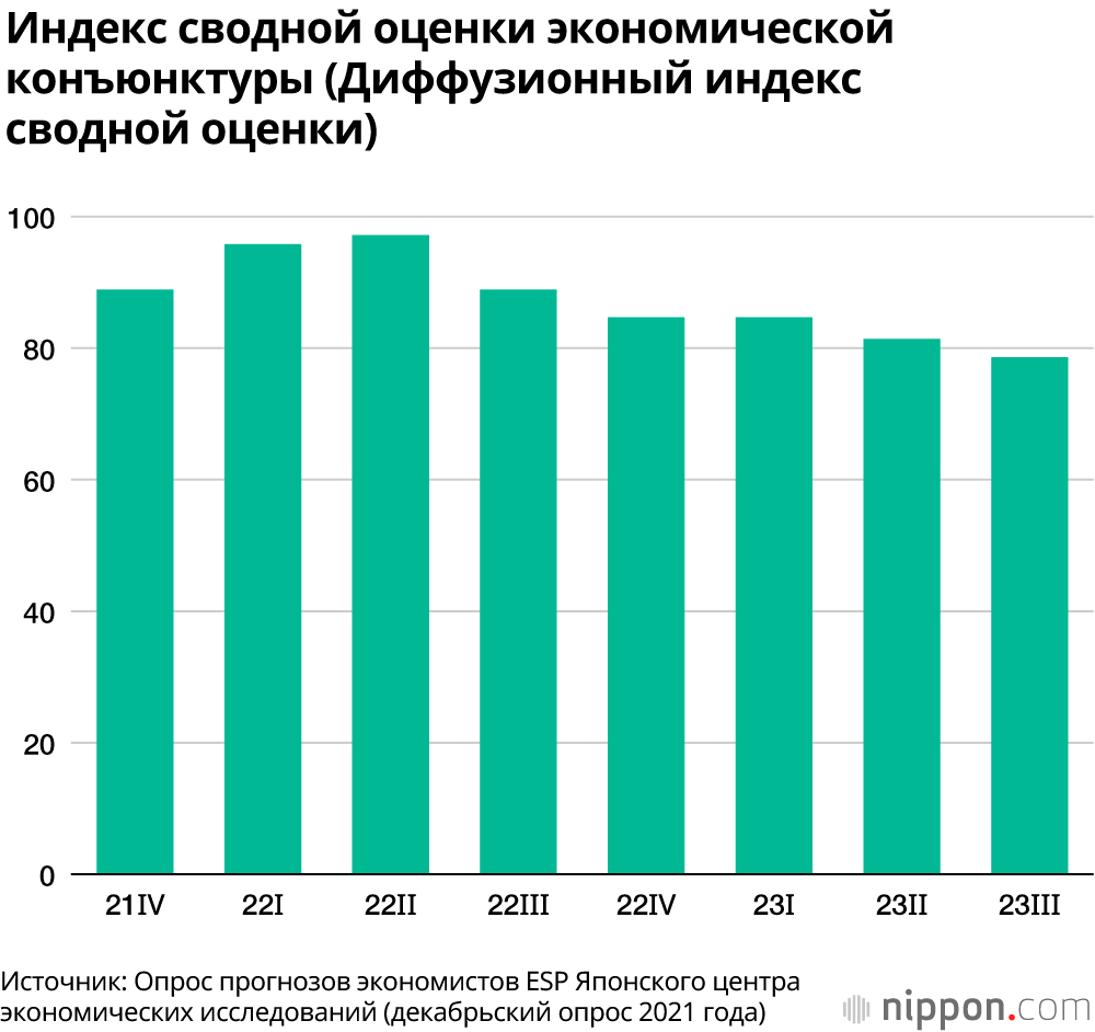 По результатам Опроса прогнозов экономистов ESP (опубликованы 15 декабря) – исследования с целью определить консенсус среди 40 экономистов частных исследовательских учреждений, средний прогноз реального роста ВВП на квартал с октября по декабрь 2021 года составил +6,39% относительно предыдущего квартала, а за весь 2021 финансовый год участники ожидают рост величиной +2,72%.