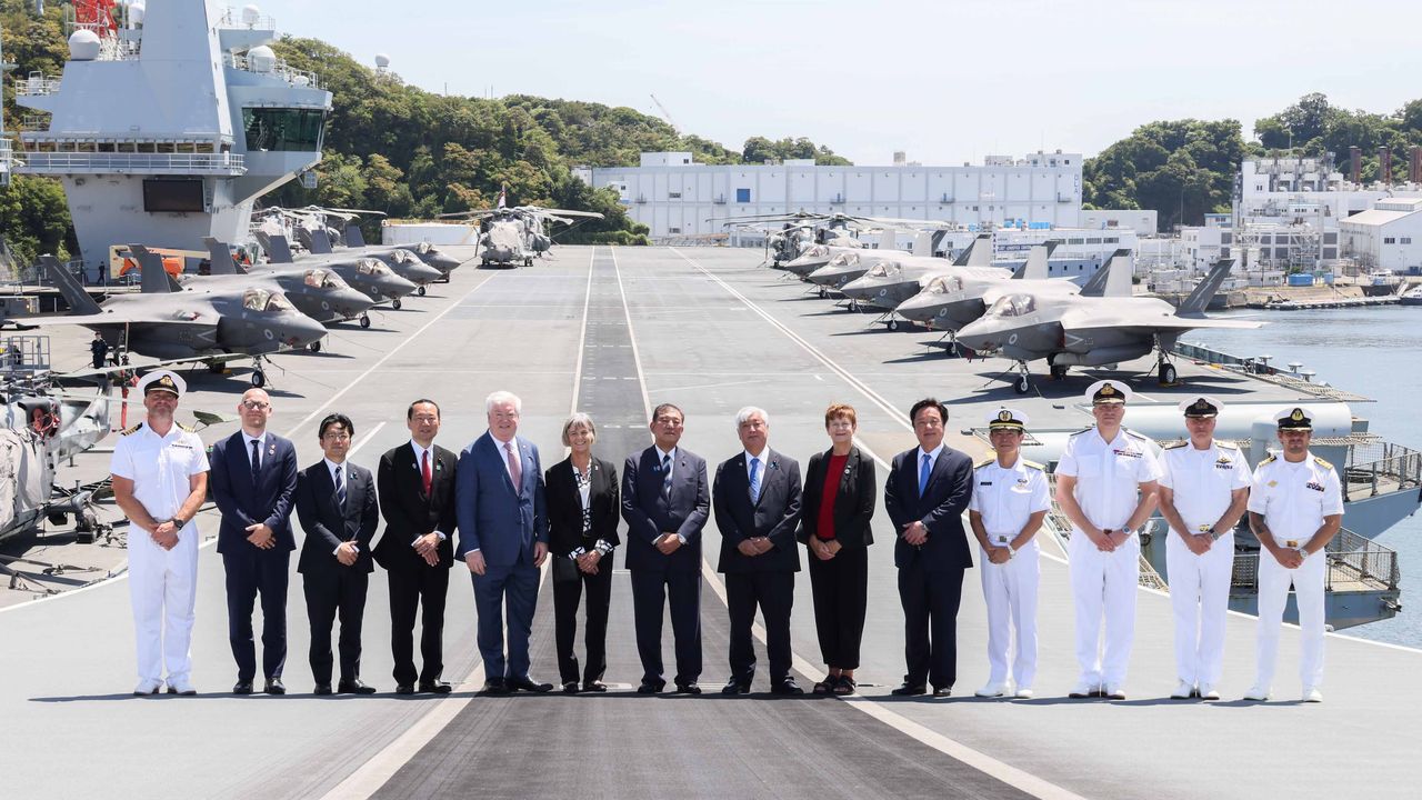 Фотография к заголовку: Премьер-министр Исиба Сигэру с другими японскими официальными лицами и британским и американским послами в Японии на взлётной палубе британского авианосца «Принц Уэльский» во время его захода в порт военно-морской базы США в Йокосуке, 23 августа 2025 г. (© Jiji)