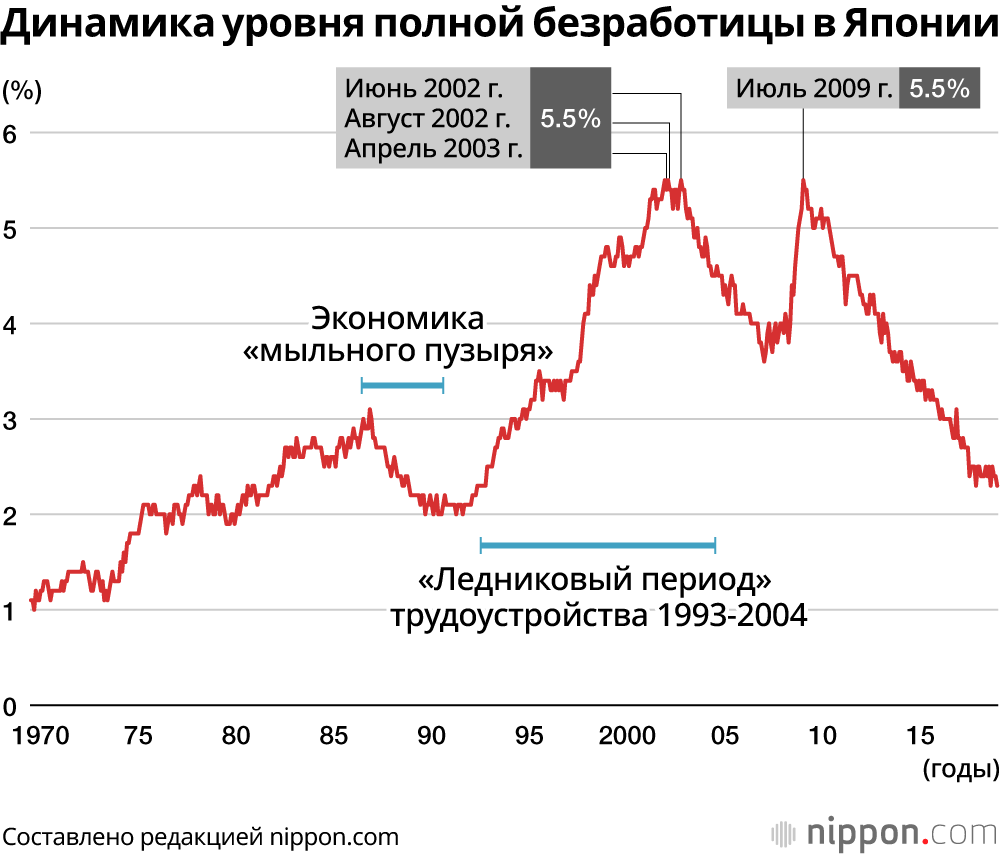 В любой стране взросление молодежи и вливание в ряды трудящихся сопровождается теми или иными сложностями. Во многих странах практиковались разнообразные меры поддержки в связи с относительно высоким уровнем безработицы среди молодежи в сравнении со взрослой частью населения. А в японском обществе со времени после окончания периода сверхвысоких темпов роста экономики и до начала 1990-х годов безработица среди молодежи удерживалась на низком уровне. Причина низкого уровня безработицы у японской молодежи состоит в широкой распространенности в масштабах страны практики единовременного найма свежих выпускников. В связи с тем, что уровень безработицы среди молодежи довольно высок в сравнении со взрослыми людьми, многие страны практиковали самые разнообразные меры оказания поддержки. Однако в японском обществе со времени после окончания периода сверхвысоких темпов экономического роста и вплоть до начала 1990-х годов безработица среди молодежи удерживалась на низком уровне. Причина сохранения низкого уровня безработицы среди японской молодежи состояла в том, что в стране широко функционирует практика единовременного найма свежих выпускников, а наниматели руководствовались предпосылкой о постоянной нехватке рабочих рук. В рамках единовременного приема на работу предприятия создавали условия для поступления на стабильную работу еще во время учебы будущего выпускника, исходя из потенциальных возможностей учащегося или студента, а по приему на работу обеспечивали обучение необходимым трудовым навыкам, а в итоге у молодежи, не имеющей практического опыта работы, была возможность обрести стабильное трудоустройство.