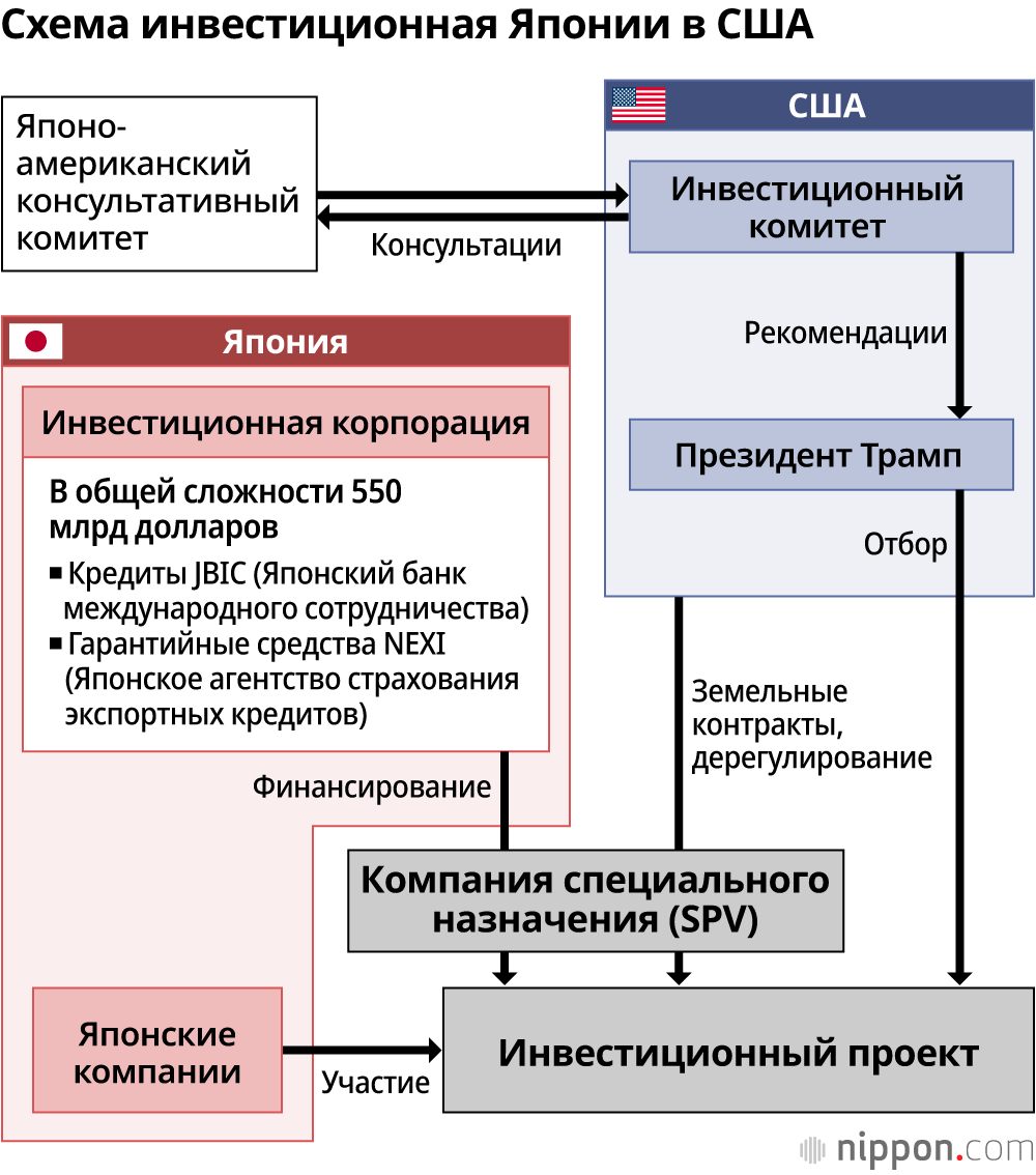 В Японии сообщалось об «инвестициях в США на сумму 550 млрд долларов», однако речь идёт не о прямом вложении средств, а об инвестиционно доступном объёме, сформированном через кредитные и гарантийные лимиты государственных финансовых институтов, таких как Японский банк международного сотрудничества (JBIC). Эта схема объединяет проекты, представляющие интерес для частных компаний. Это не прямой перевод средств, а система кредитов и гарантий, призванная поддерживать самостоятельные инвестиционные решения бизнеса. США также предполагают использовать её как инструмент освоения рынка.