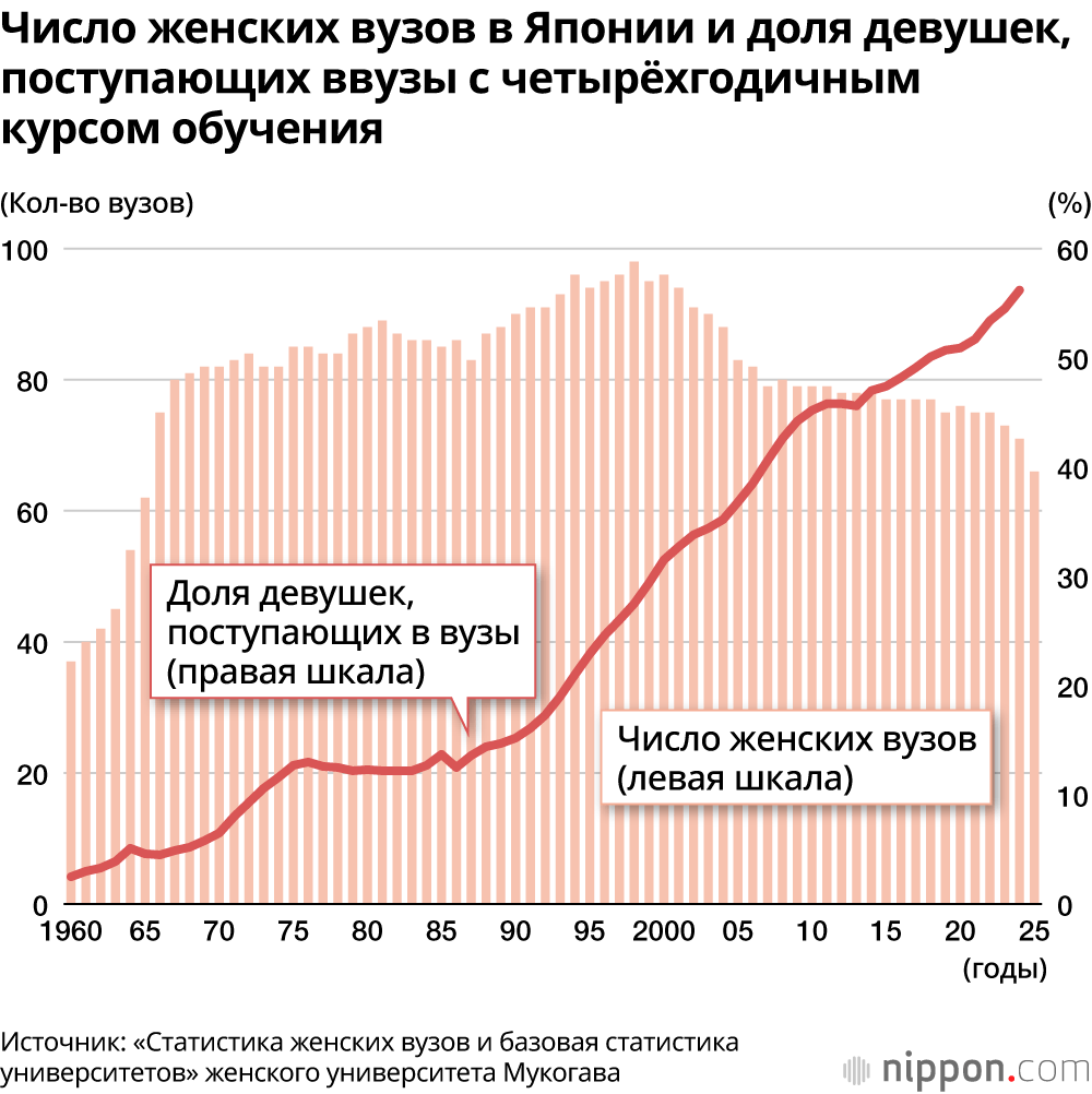 Несмотря на рост девушек, стремящихся получить высшее образование, количество женских университетов с четырёхлетней программой обучения неуклонно снижается. Если на пике популярности в 1998 году в Японии насчитывалось 98 женских вузов, то всего за четверть века их число сократилось на треть, – до 66 в 2025 году. При этом 70% оставшихся вузов страдают от недобора учащихся.