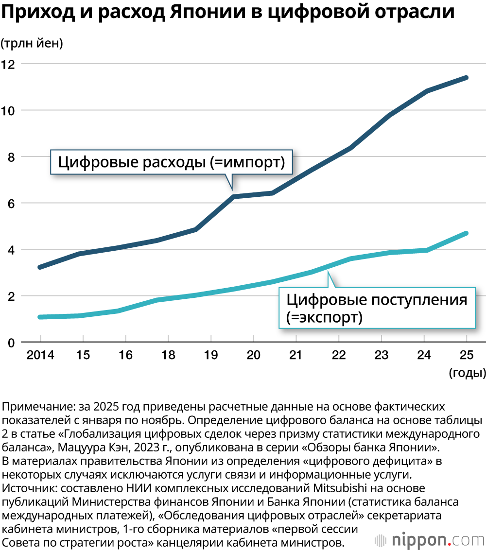 Японский «цифровой дефицит» продолжает оставаться на высоком уровне. Согласно статистическим данным о трансграничных платежах Министерства финансов и Банка Японии, дефицит по платежам за цифровые услуги, связанные с цифровой отраслью, уже по итогам 2025 года, вероятно, превысит 6 трлн йен. Хотя экспорт из Японии услуг, связанных с цифровой отраслью, превысил 4 трлн йен благодаря росту авторских отчислений, в том числе лицензионных выплат за контент, в частности, за анимэ, объем выплат за рубеж превышает 10 трлн йен (см. график ниже).