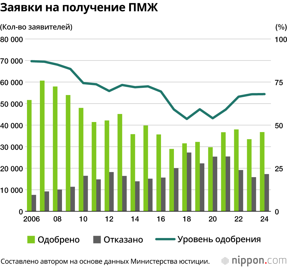 Конечно, снижение процента удовлетворенных заявок не обязательно означает ужесточение стандартов одобрения; это также может быть результатом изменений в характеристиках «типичного заявителя». Но приведенные выше цифры демонстрируют: в то время как численность иностранных граждан в Японии резко возросла за последние несколько десятилетий, число тех, кто получает ПМЖ или японское гражданство, – нет.