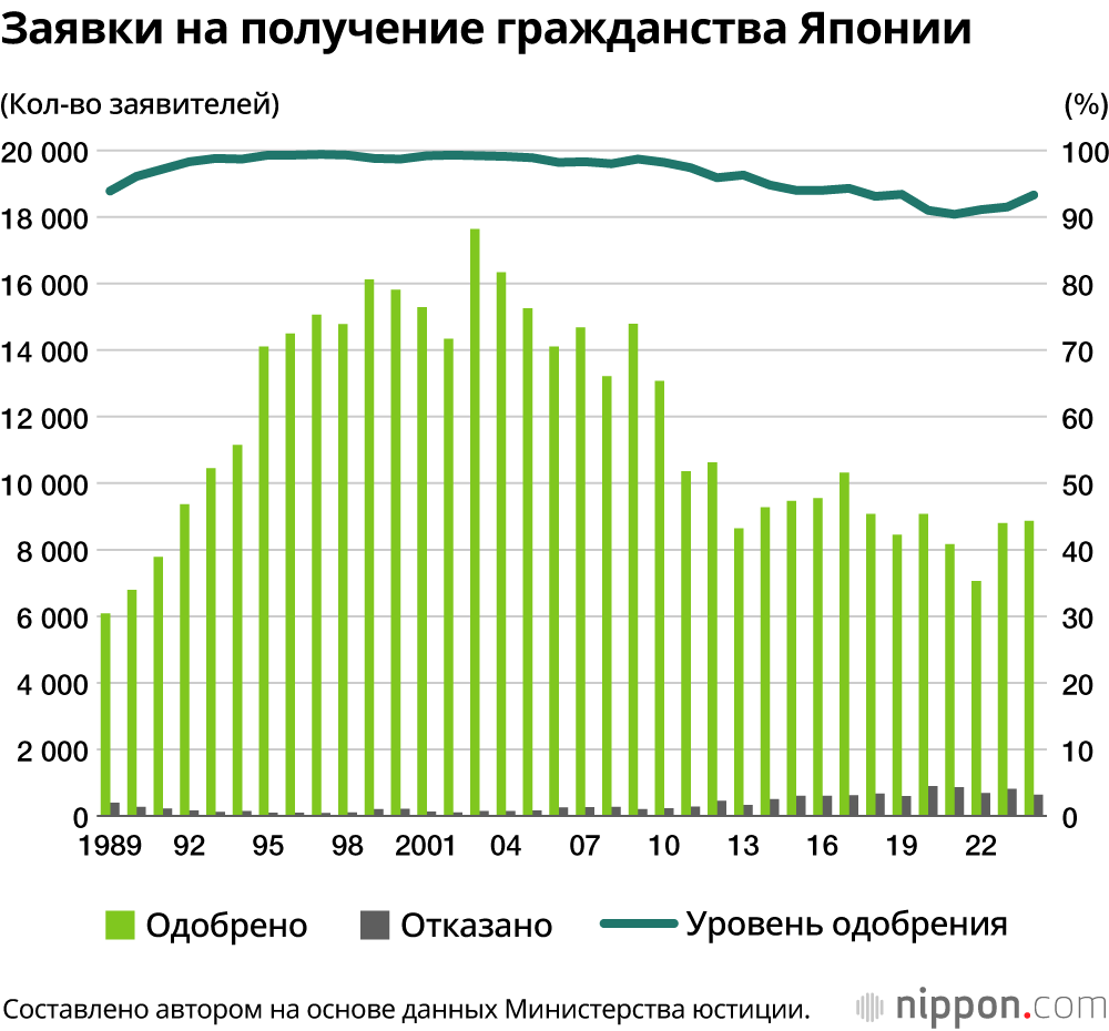 Статистика натурализации ведется с 1989 года. Согласно этим данным, число уроженцев других стран, ежегодно получающих японское гражданство, сокращается с 2003 года, когда оно достигло пика (около 18 000 человек). С 2010 года этот показатель едва поднимался выше 10 000 человек. Доля успешных заявок остается высокой, стабильно превышая 90%, однако в последние годы она несколько снизилась, с 2013 года оставаясь на уровне ниже 95%.