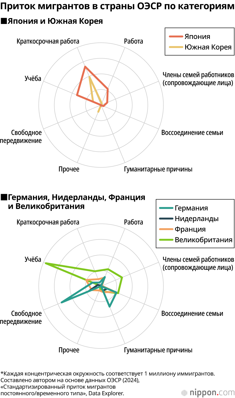 Статистика, опубликованная Организацией экономического сотрудничества и развития (ОЭСР), позволяет сравнить подход Японии к отбору заявителей на получение визы с практикой других стран. Если не считать туризм, подавляющее большинство виз, выдаваемых японским правительством, предназначены либо для учебы, либо для работы (как краткосрочной, так и долгосрочной). Иностранцы, не являющиеся студентами или работниками, крайне редко получают разрешение на длительное пребывание.