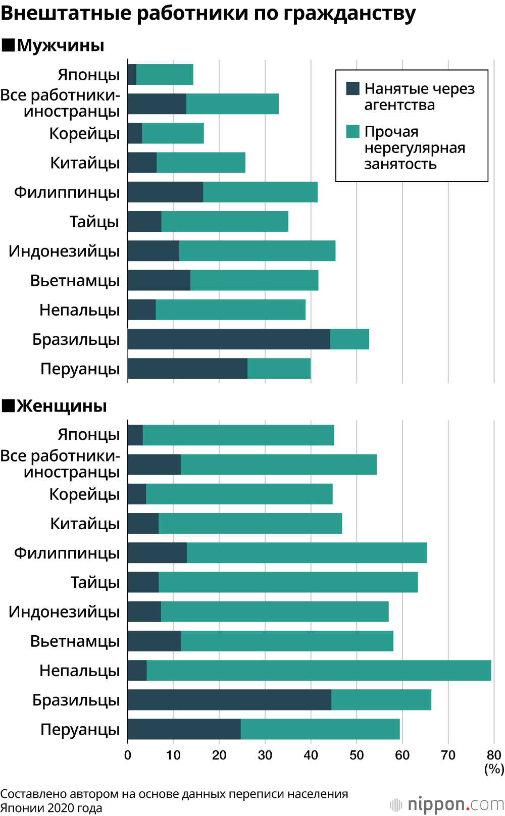 Согласно последним данным переписи населения (2020 год), доля иностранных граждан, занятых в нестандартных формах занятости, значительно выше, чем среди японцев. Эта разница особенно заметна среди сотрудников-мужчин. Если среди японцев лишь 14% мужчин заняты на нерегулярных должностях, то среди бразильцев этот показатель составляет 53%, среди индонезийцев – 45%, а среди вьетнамцев, непальцев и перуанцев – около 40%. Среди женщин разрыв менее разителен, но даже при этом процент «нерегулярных» сотрудников заметно выше среди работниц из Юго-Восточной Азии, Южной Америки и Непала (см. графики).